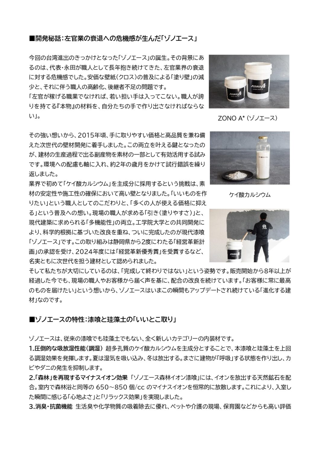 静岡・三島の株式会社ナガショウ、現代漆喰「ZONO A® (ゾノエース)」で台湾進出。
