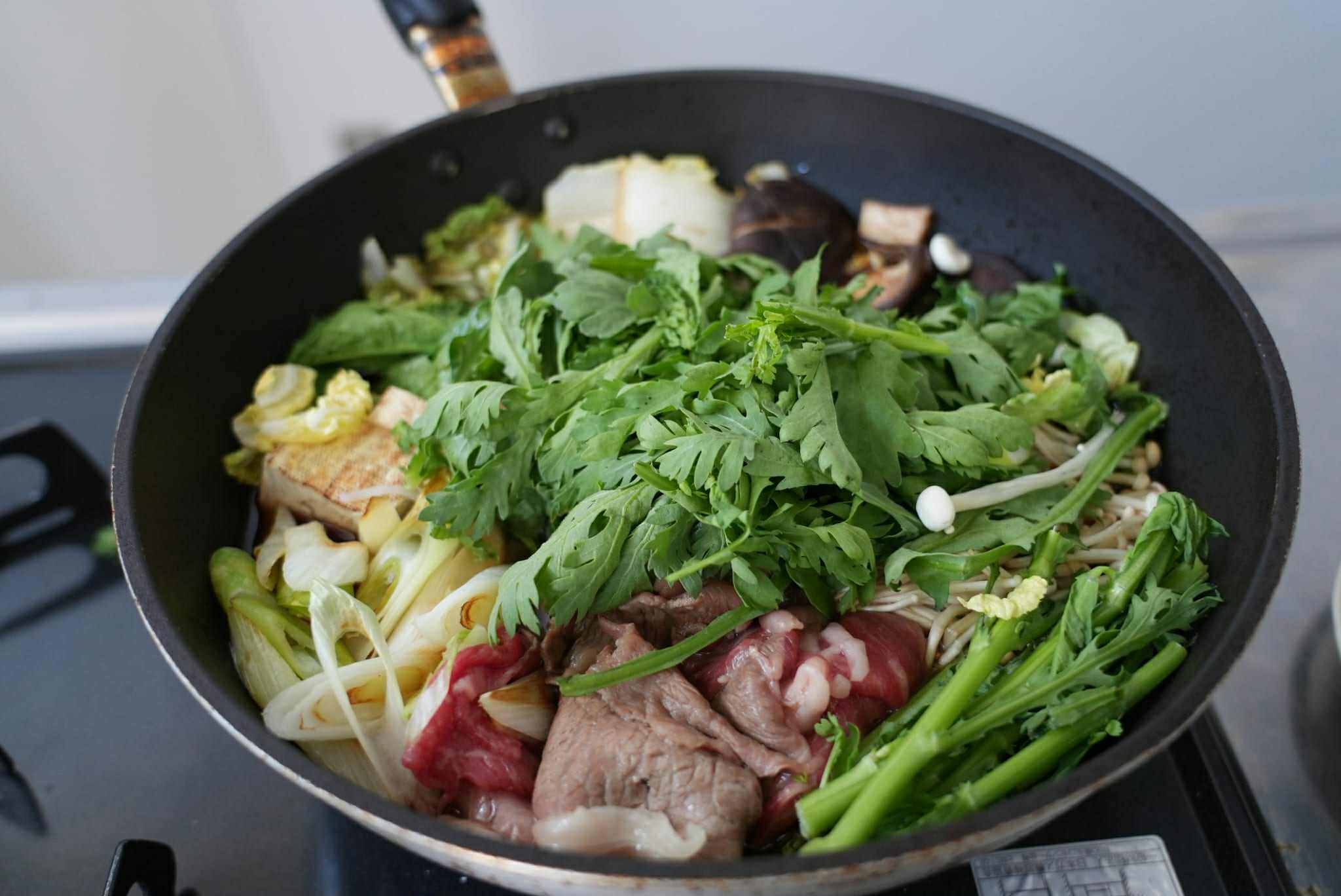 ポイントはお肉を一旦軽く焼いた後取り出すこと。肉のうま味を野菜に染み込ませながらお肉は柔らかくいただくことができます。